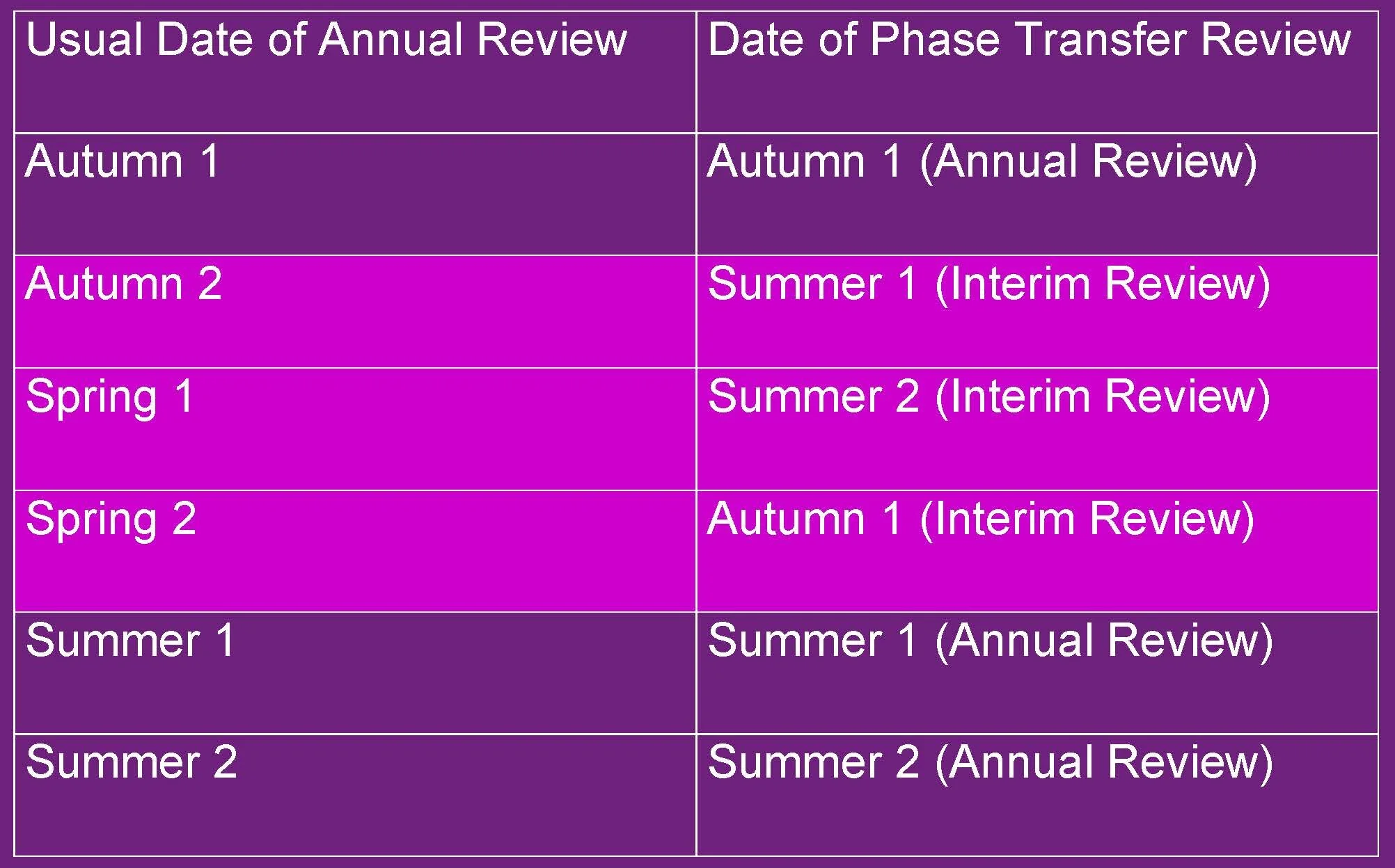 To clarify the following tables details when learners with EHCPs will require an additional interim review to support phase transfer: